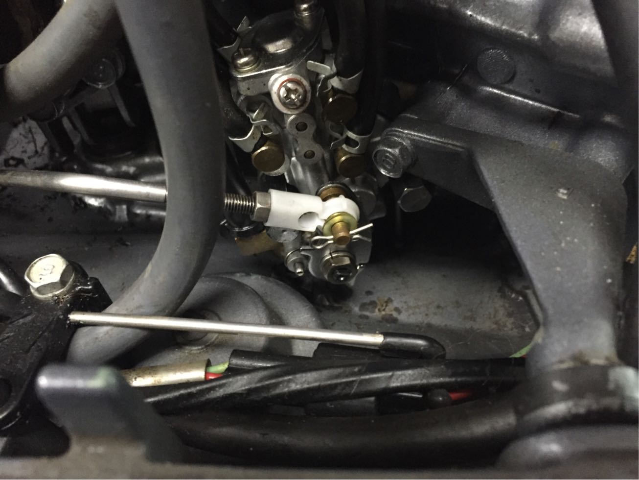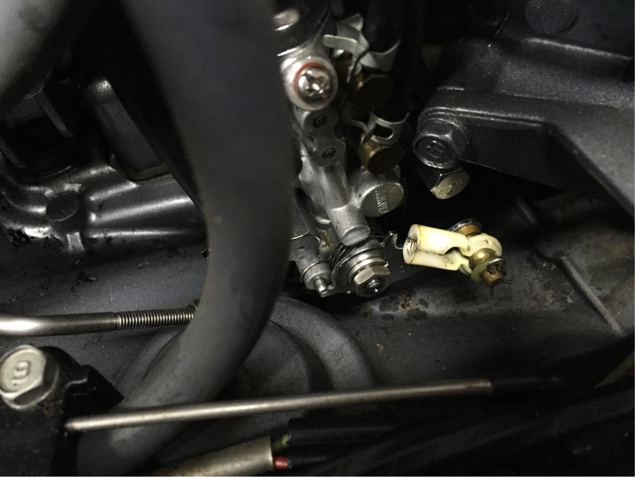 正常であれば、スロットルと連動してオイルポンプを開閉し、オイルの量を調整しているのですが、リンクが外れているので常に全開でオイルを送っていたようです。